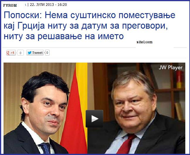 ΑπάντησηΔιαγραφήToday, 22 July 2013, at the Council of the European Union in Brussels, the Minister of Foreign Affairs of the FYROM, H.E. Mr. Nikola Poposki, had a meeting with the Greek Deputy Prime Minister and Minister of Foreign Affairs, H.E. Mr. Evangelos Venizelos.