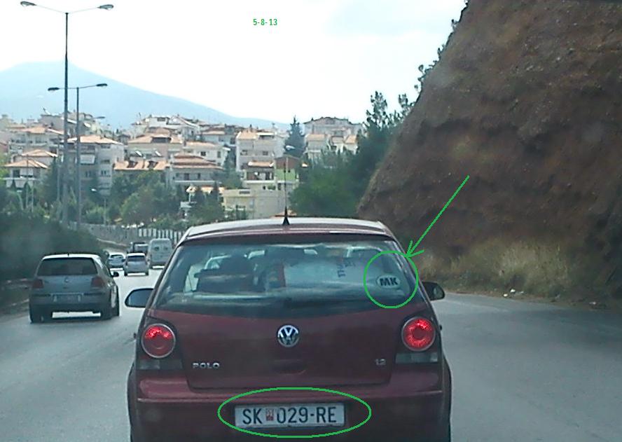 Πράγματι, από την φωτογραφία στο ύψος της Πυλαίας φαίνεται καθαρά το αυτοκόλλητο με τα αρχικά ΜΚ που δηλώνει σαφώς Μακεδονία. Πουθενά δίπλα, παραδίπλα δεν υπάρχει το ακυρωτικό σήμα επιφύλαξης (ΕΙΚ.1,2) που θα έπρεπε να έχει κολλημένο από τα σύνορα για να πληρεί τις προϋποθέσεις κυκλοφορίας στην Ελλάδα. Δεν είναι η μοναδική περίπτωση. Οι παραλίες Χαλκιδικής και Πιερίας έγιναν και φέτος μάρτυρες σκοπιανών αυτοκινήτων που δηλώνουν σε Έλληνες και ξένους Μακεδονία, χωρίς την απαραίτητη ακύρωση από την χώρα μας (ΕΙΚ.1,2). Συνέβησαν και περιστατικά καταστροφής πινακίδων που καταγράφηκαν από τα ΜΜΕ της γειτονικής χώρας. Επί πλέον, από σκοπιανά ΜΜΕ, διαδόθηκε ότι το ΥΠΕΞ της χώρας τους επέδωσε νότα διαμαρτυρίας στην χώρα μας για δήθεν βανδαλισμούς κλπ.