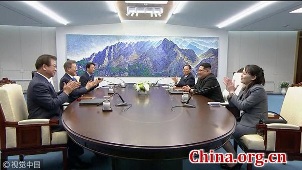 North Korean leader Kim Jong-un and South Korean President Moon Jae-in embraced after pledging to work for the "complete denuclearisation of the Korean peninsula."