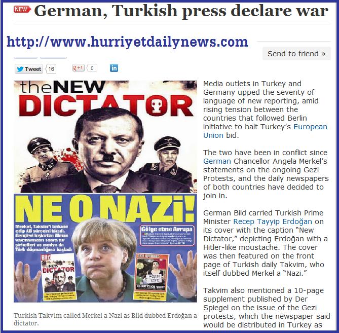Berlin initiative to halt Turkey’s European Union bid. The two have been in conflict since German Chancellor Angela Merkel’s statements on the ongoing Gezi Protests, and the daily newspapers of both countries have decided to join in.
